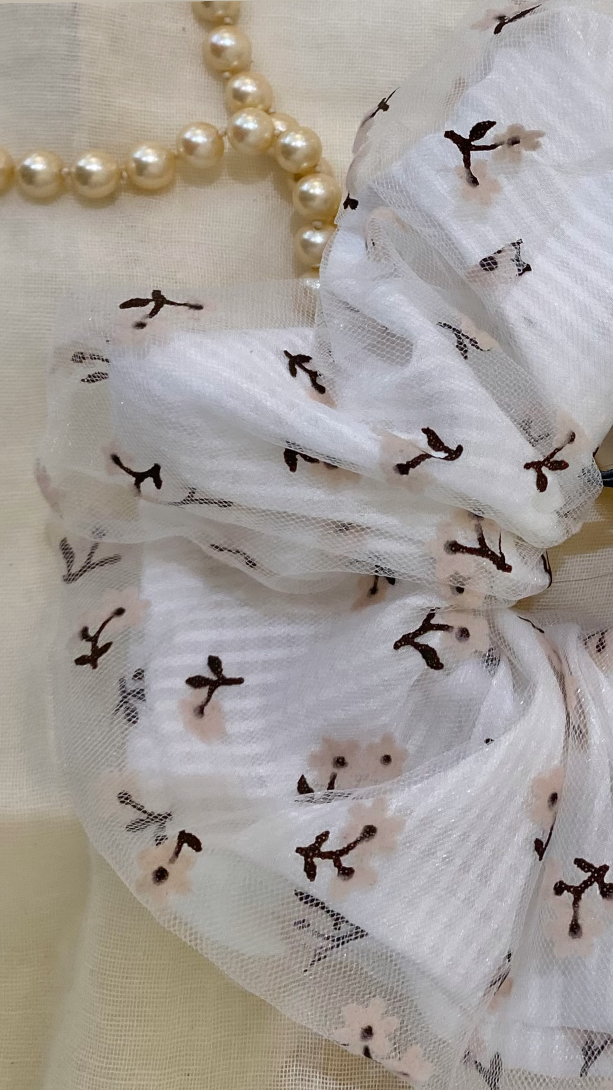 베이지 플로랄 튤레이스 헤어끈