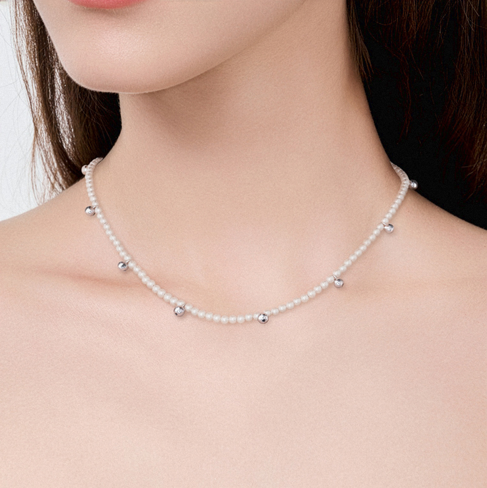 단조롭지 않게 실버볼장식과 함께 진주네크라인을 예쁘게 만들어 줄 화이트 진주네크리스입니다.